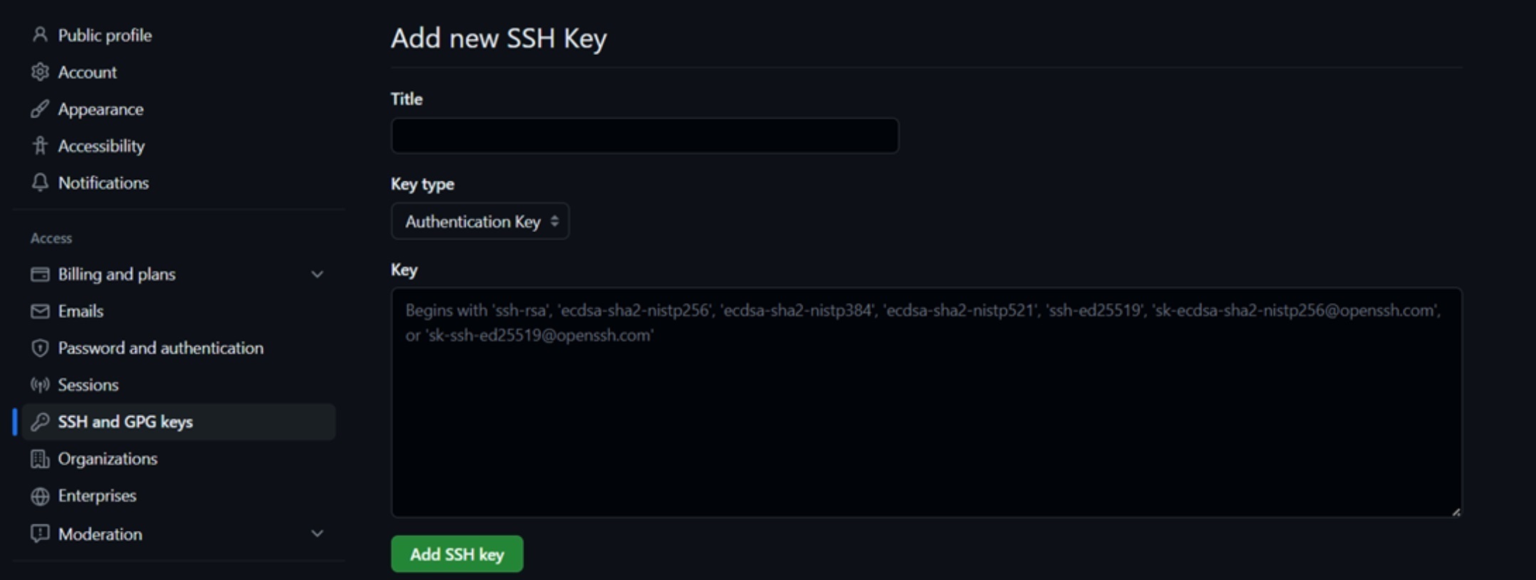 Copy and paste the result from the public key in the Key text area provided on your GitHub and click “Add SSH key”.